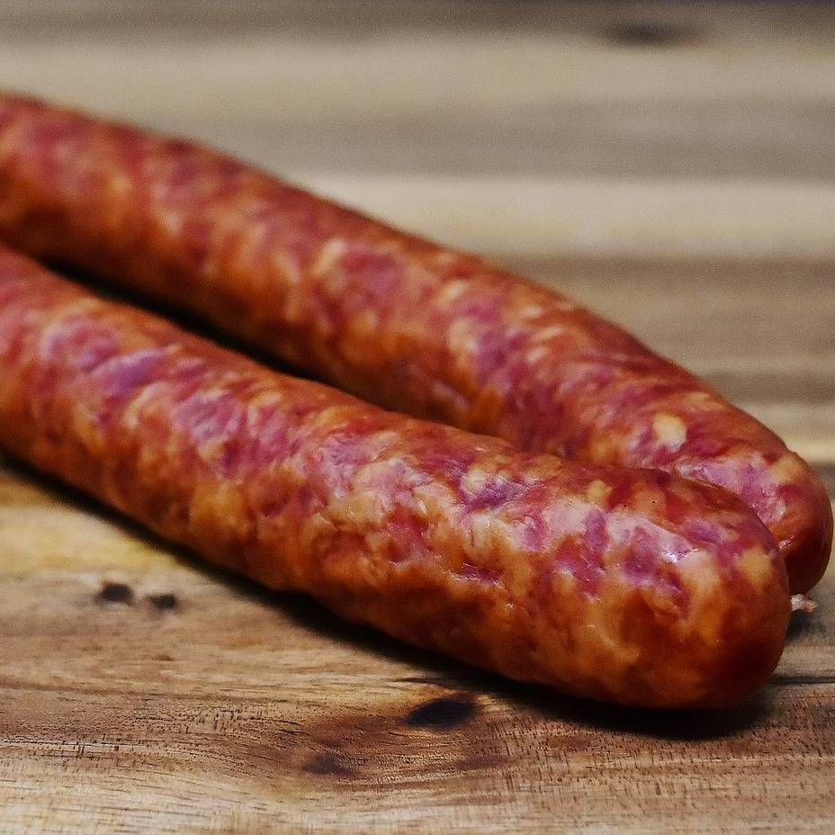 Τα χειροποίητα λουκάνικα φτιάχνονται με χοιρινό ψαχνό και λίπος, είναι αρωματισμένα με πορτοκάλι, βότανα και μπαχαρικά και καπνίζονται για ώρες σε ξύλο ελιάς.